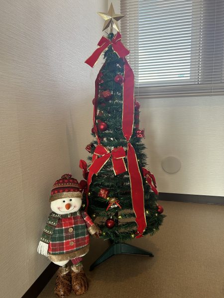 応接室前の廊下には雪だるまのぬいぐるみとクリスマスツリーです🎄